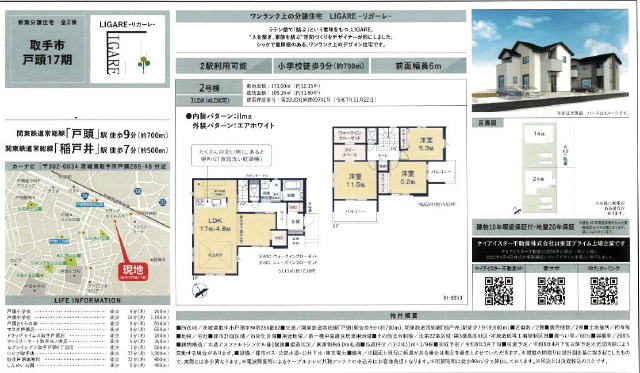 こちらは、取手市戸頭にあります新築一戸建、全2棟の内の2号棟です。敷地の広さは52.33坪、建物は31.80坪、3LDK(間仕切りで4LDK対応可)+カースペース2台分の2026年3月下旬完成予定新築分譲住宅です。